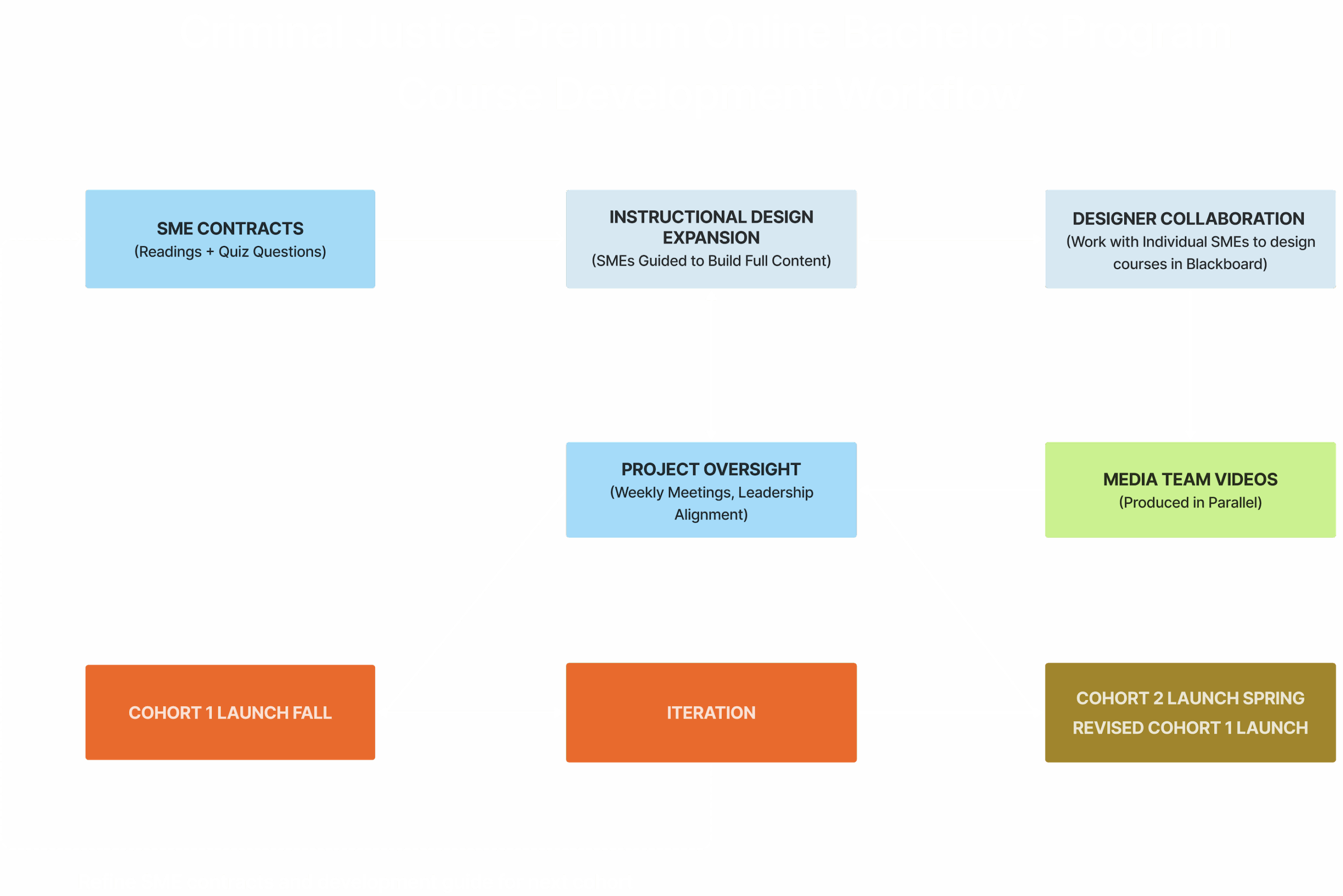 As part of my role at SHSU Online, I led the instructional design and delivery of a large-scale Criminal Justice Digital BA Program—25+ fully online courses developed across fall and spring terms. Built end-to-end with scalable templates, consistent QA, and authentic assessments, the program provided a high-quality, accessible pathway to a Criminal Justice degree, ensuring academic rigor while meeting accreditation, accessibility, and the needs of a diverse online learner population.